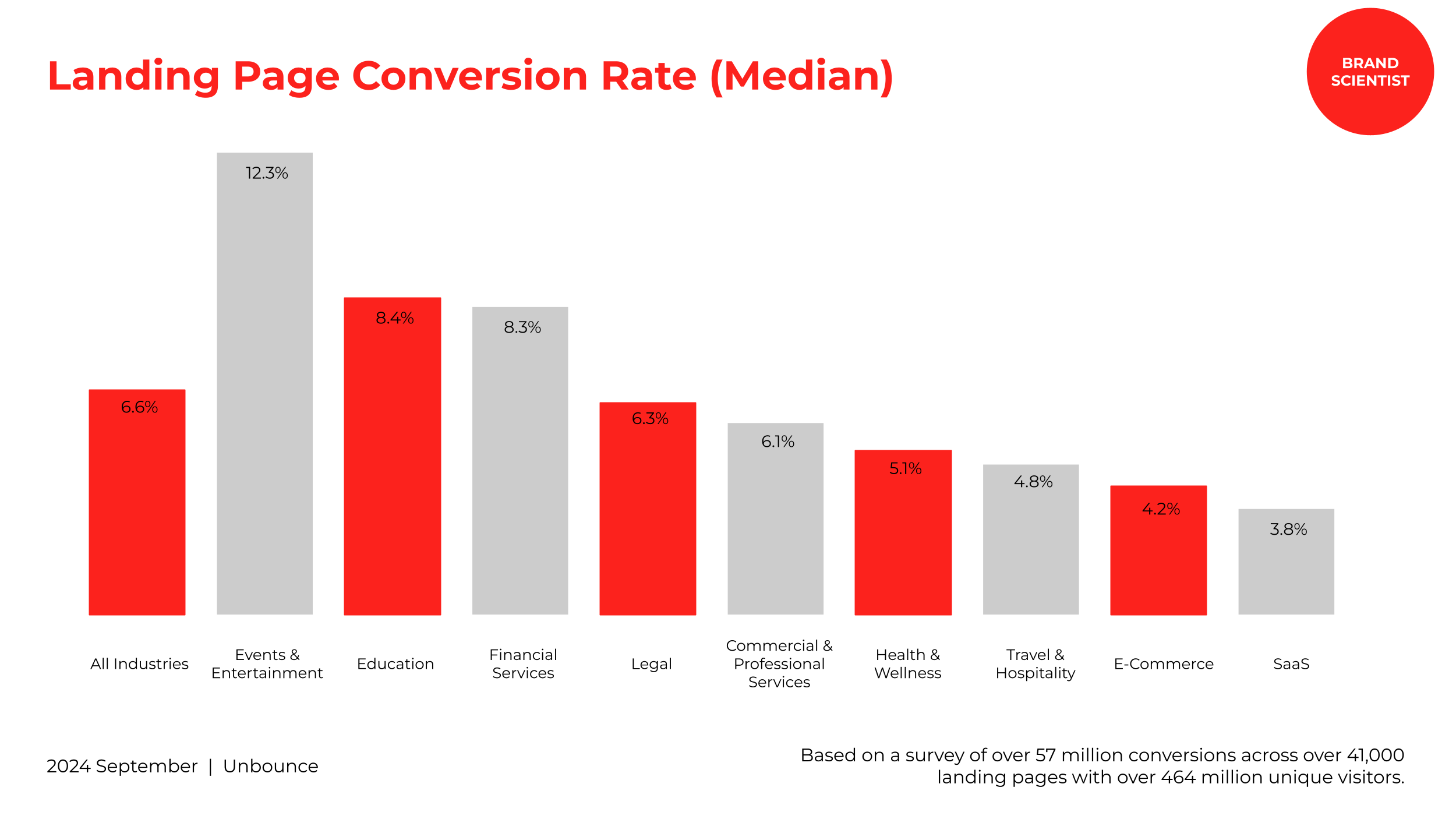 Landing page conversion rates vary significantly across industries and traffic sources, according to Unbounce's comprehensive Conversion Benchmark Report. The study analyzed over 57 million conversions across 41,000+ landing pages and 464 million unique visitors, revealing a median conversion rate of 6.6% across all sectors.