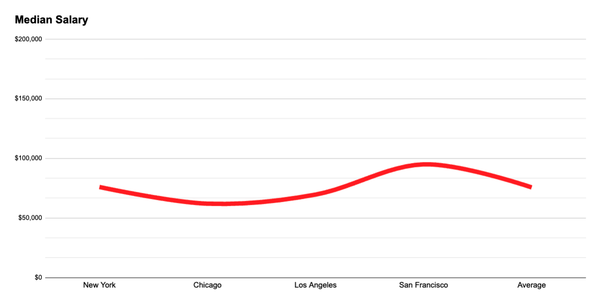 This chart displays the median salary for Community Managers across different cities. San Francisco offers the highest median salary, nearing $100,000, while Chicago and Los Angeles fall on the lower end of the spectrum. Overall, the national median salary for this role hovers around $75,000, highlighting regional differences in compensation.