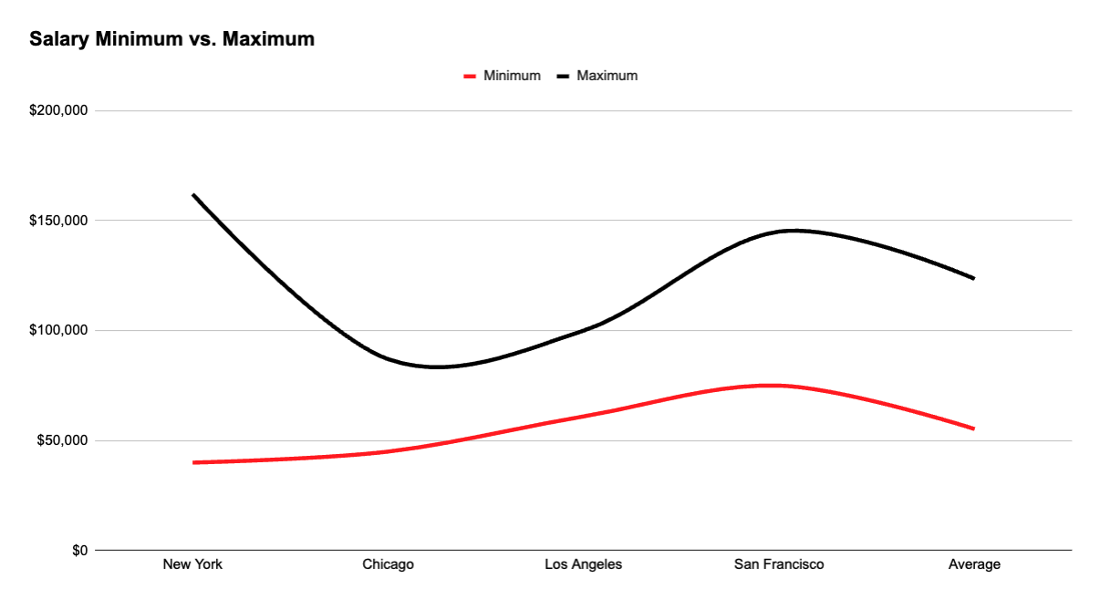 This chart highlights the salary range for Community Managers across major cities. San Francisco offers the highest compensation, with maximum salaries reaching around $145,000 and minimums near $75,000. In contrast, New York displays the widest gap between minimum and maximum pay, while Chicago and Los Angeles show lower overall salary bands.