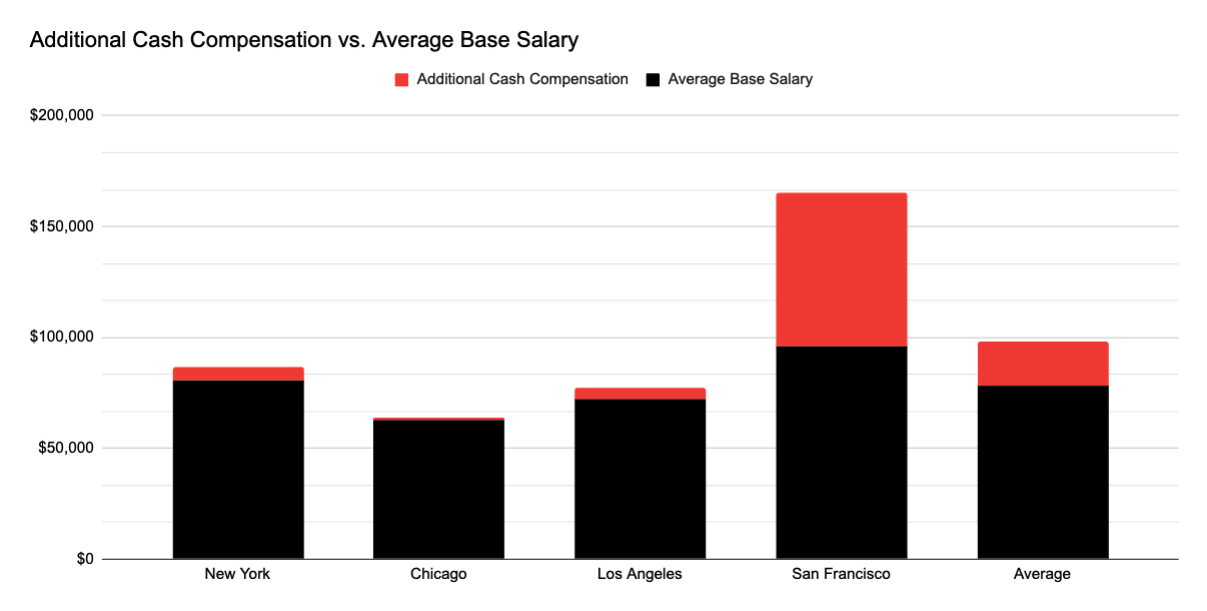 This chart shows the average base salary and additional cash compensation for Community Managers across major cities. San Francisco stands out with a significantly higher total compensation, driven by a large portion of additional cash. In contrast, cities like Chicago and Los Angeles offer lower overall packages with minimal bonus compensation.