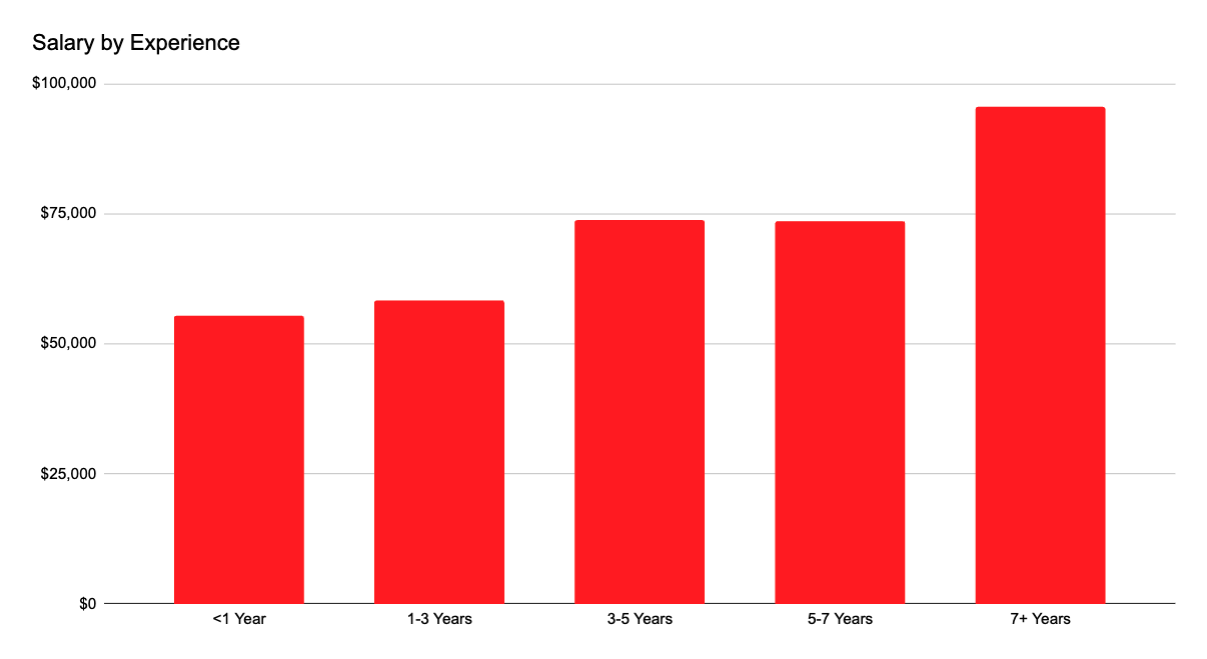 This chart shows Community Manager salaries by years of experience. Salaries increase steadily with more experience, with the highest average earnings for those with 7+ years. The jump in compensation is most notable after 3 years, indicating experience is a strong factor in salary growth for this role.