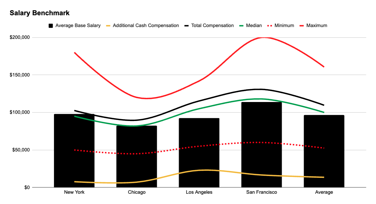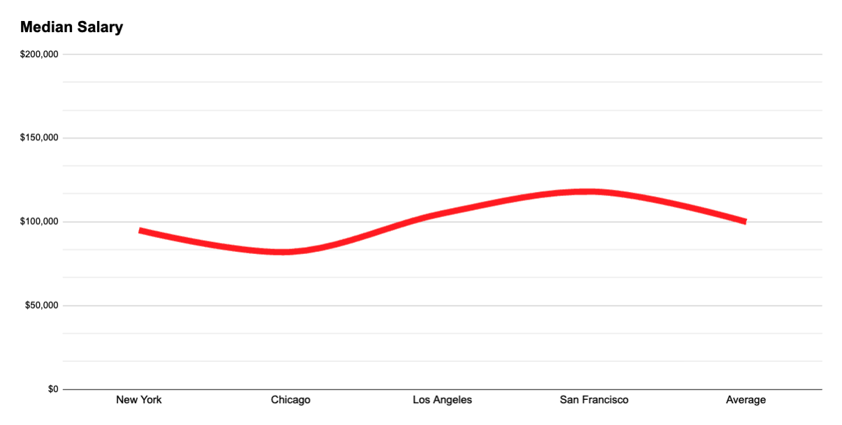 This chart shows the median salary for Digital Marketing Managers across major cities. San Francisco leads with the highest median pay, while Chicago shows the lowest. Overall, the national average median salary for this role sits around $100,000, reflecting strong compensation trends in the digital marketing field.