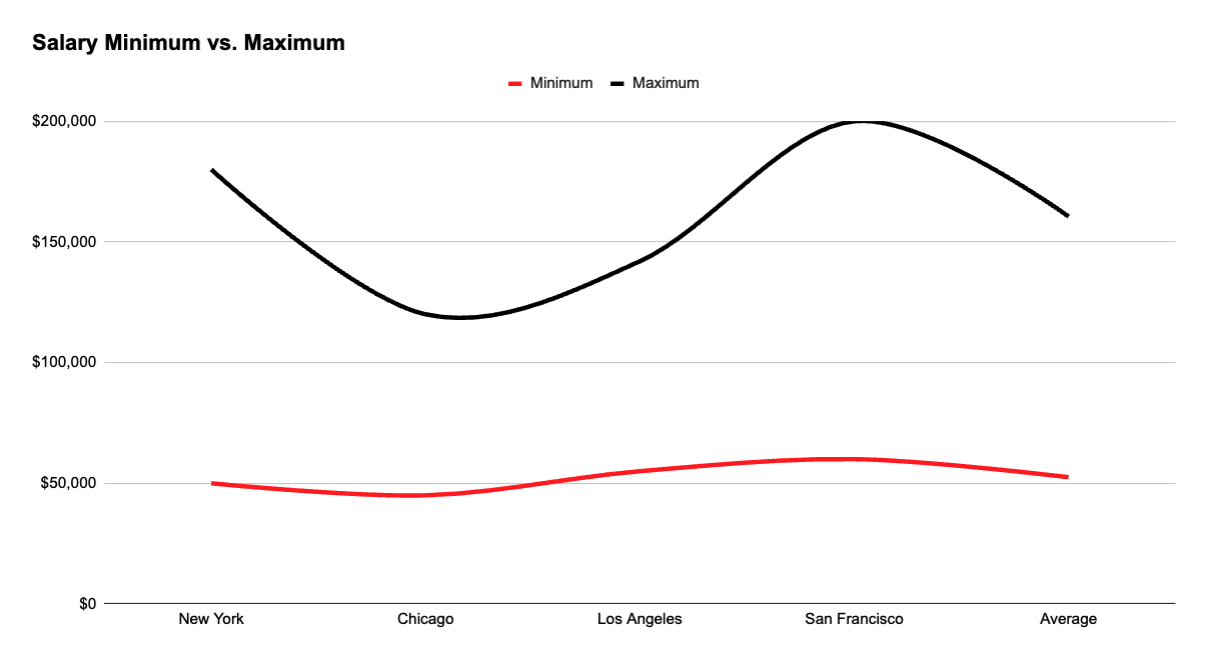 This chart illustrates the salary range for Digital Marketing Managers across key cities. San Francisco stands out with the highest maximum salary nearing $200,000, while Chicago shows the lowest maximum and minimum compensation. The average range reveals a broad disparity, highlighting how geography significantly impacts earning potential in this role.