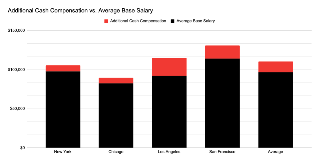 This chart displays the average base salary and additional cash compensation for Digital Marketing Managers across major cities. San Francisco leads in total compensation, with a notably higher portion of additional cash compared to other cities. Los Angeles also shows a strong compensation package, while Chicago reflects the lowest overall earnings in this role.