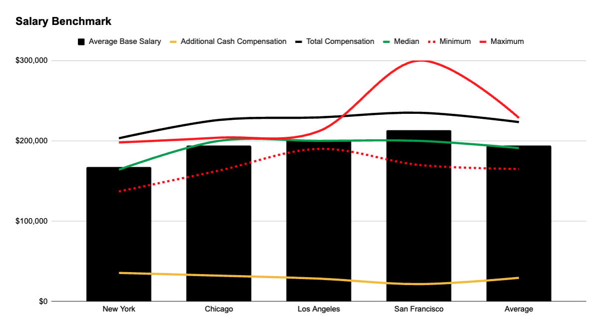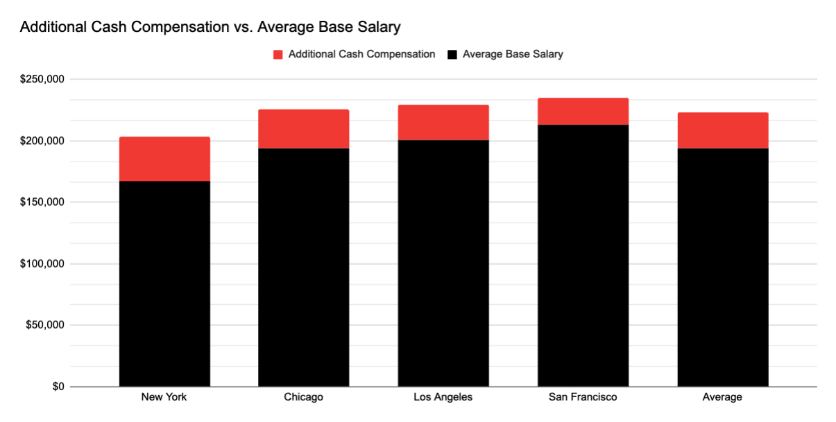 This chart compares average base salaries and additional cash compensation for Directors of Product Marketing across major cities. San Francisco leads in total compensation, followed closely by Los Angeles and Chicago, with all three offering strong base pay and bonuses. New York shows a noticeable gap in base salary but makes up for it with relatively higher bonus contributions.
