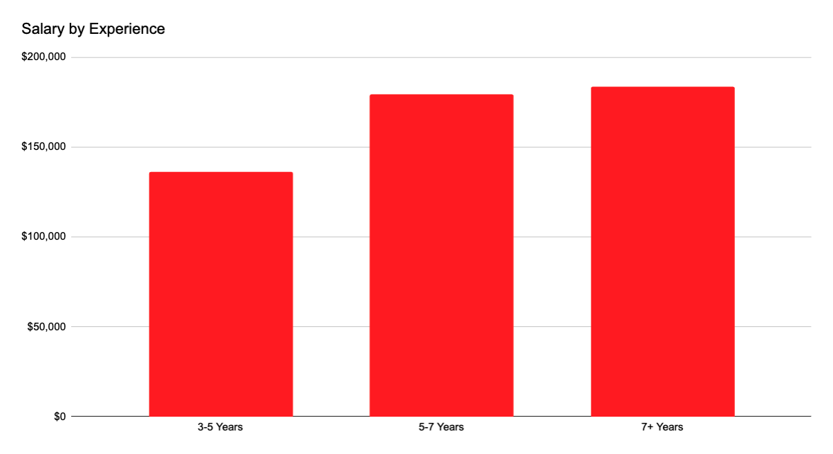 This chart shows average salaries for Directors of Product Marketing based on experience level. Salaries increase significantly from 3–5 years to 5–7 years of experience, with a modest rise continuing into the 7+ year range. This trend underscores the strong correlation between experience and compensation in product marketing leadership roles.