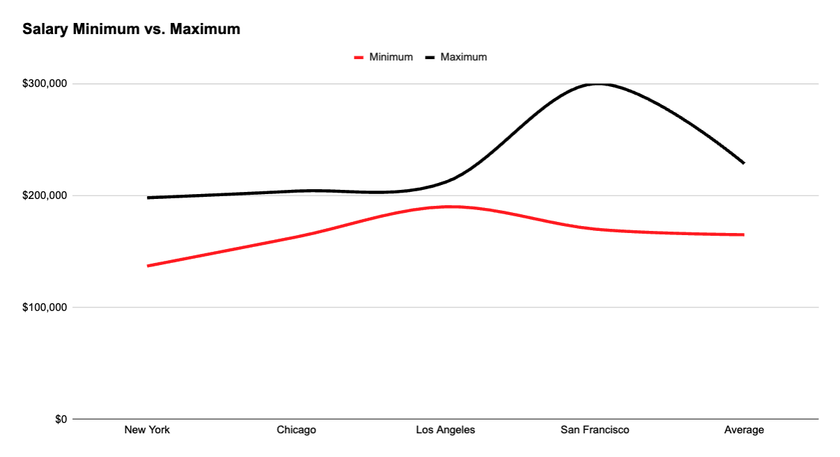 This chart shows the minimum and maximum salary range for Directors of Product Marketing across major U.S. cities. San Francisco offers the highest earning potential, with a notable spike in maximum compensation compared to other locations. While minimum salaries show less variation, Los Angeles stands out with the highest baseline pay among the cities shown.