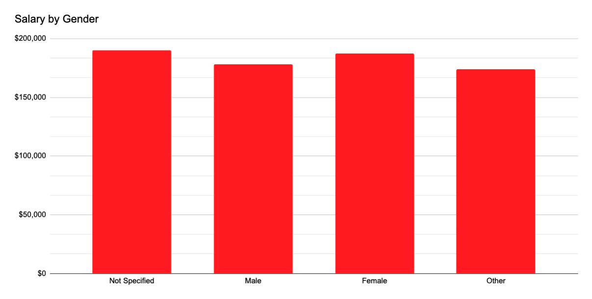 This chart shows average salaries for Directors of Product Marketing by gender. Those who did not specify their gender report the highest average compensation, followed by female and male respondents, who earn similar amounts. Individuals identifying as "Other" have the lowest average salary, suggesting ongoing disparities in pay equity across gender identities.