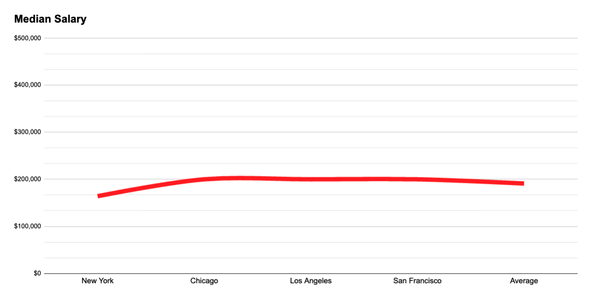 This chart displays the median salary for Directors of Product Marketing across major U.S. cities. Chicago, Los Angeles, and San Francisco show similar median compensation levels, while New York trails slightly behind. Overall, the data suggests a relatively consistent median salary across markets, with modest regional variation.