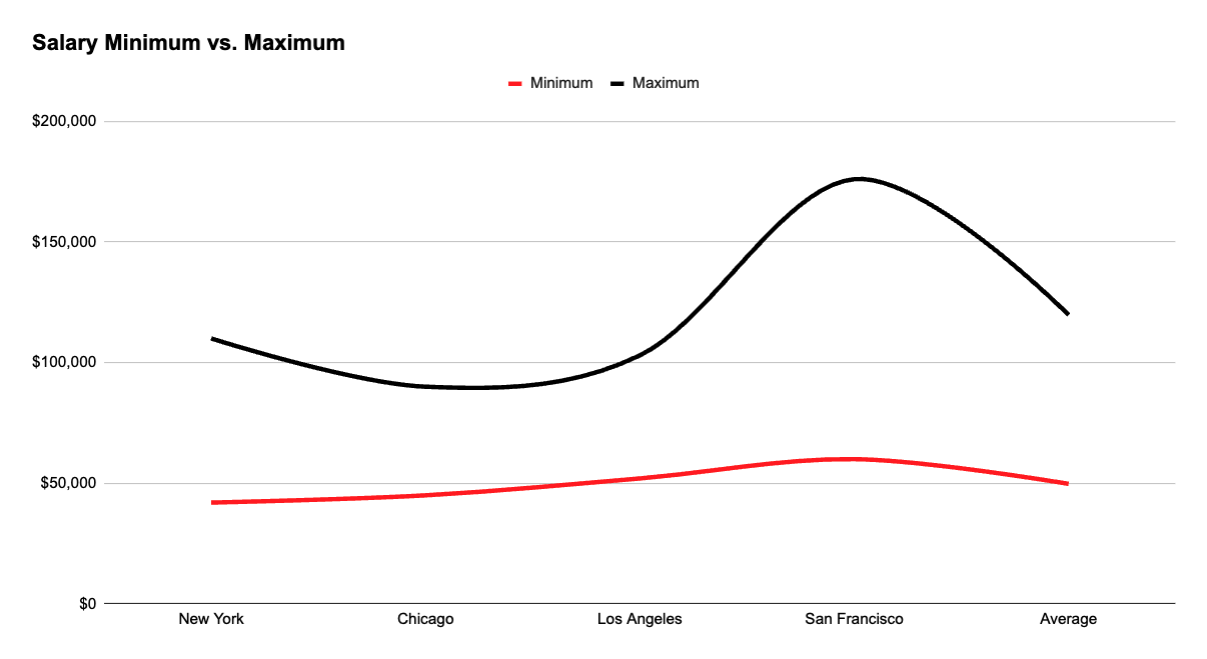 This chart highlights the salary range for Event Planners, comparing minimum and maximum salaries across key cities. San Francisco stands out with the highest earning potential, particularly on the maximum end, reaching nearly $180,000. Meanwhile, other cities like Chicago and Los Angeles show more modest ranges, with New York offering a relatively high minimum compared to others.