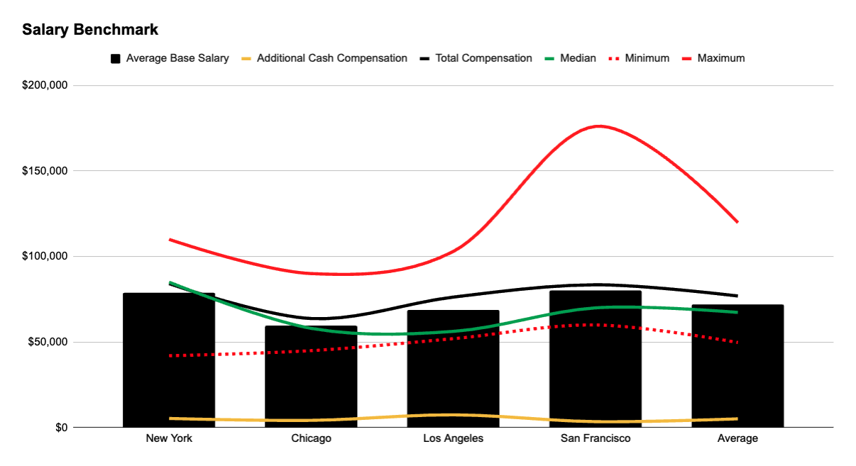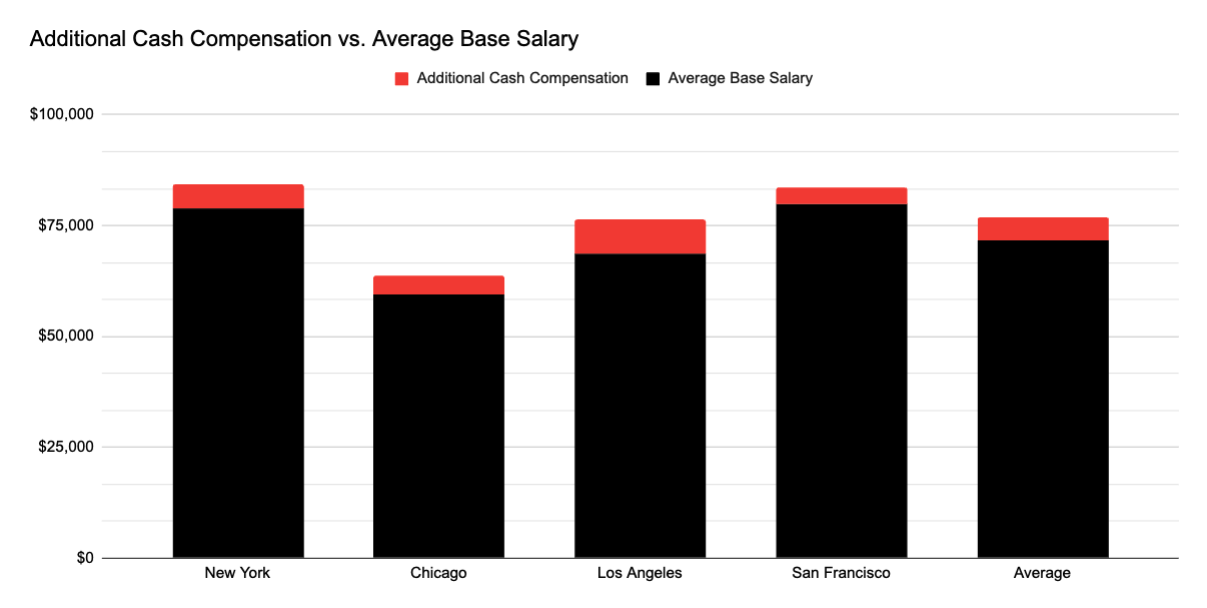 This chart shows the average base salary and additional cash compensation for Event Planners across major cities. New York and San Francisco lead in overall compensation, with base salaries around $80,000 and modest additional compensation. On average, Event Planners earn a total compensation just over $75,000, with variation depending on location.