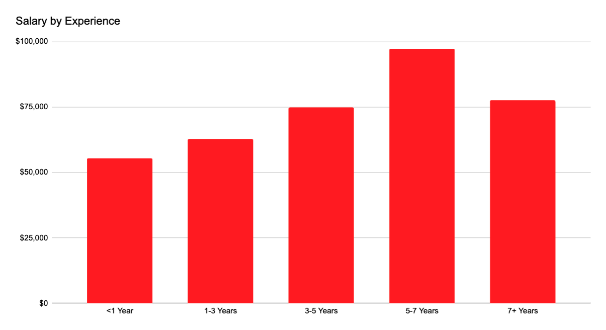 This chart shows the average salary for Event Planners based on years of experience. Salaries generally increase with experience, peaking at the 5–7 years mark. Interestingly, those with over 7 years of experience earn slightly less than the 5–7 year group, suggesting a potential plateau or variability in senior-level compensation.