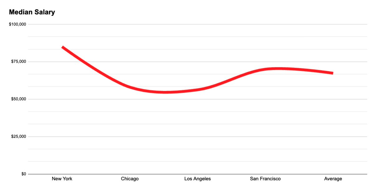 This chart shows the median salaries for Event Planners across major U.S. cities. New York has the highest median salary, while Chicago and Los Angeles sit on the lower end. San Francisco offers slightly above-average compensation, bringing the overall national median close to $70,000.
