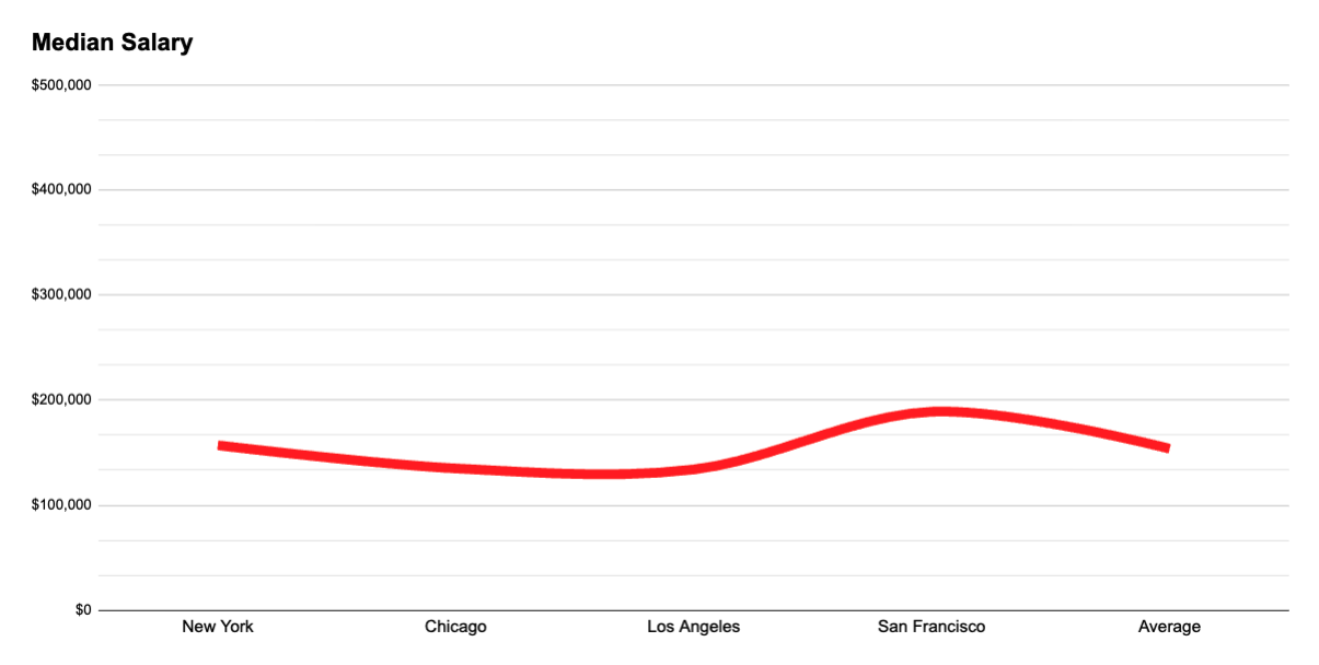 This chart displays the median salary for Senior Product Marketing Managers across major cities. San Francisco leads with a significantly higher median salary, while Chicago and Los Angeles report the lowest. Overall, the data emphasizes the geographic influence on pay, with West Coast markets offering notably stronger compensation.