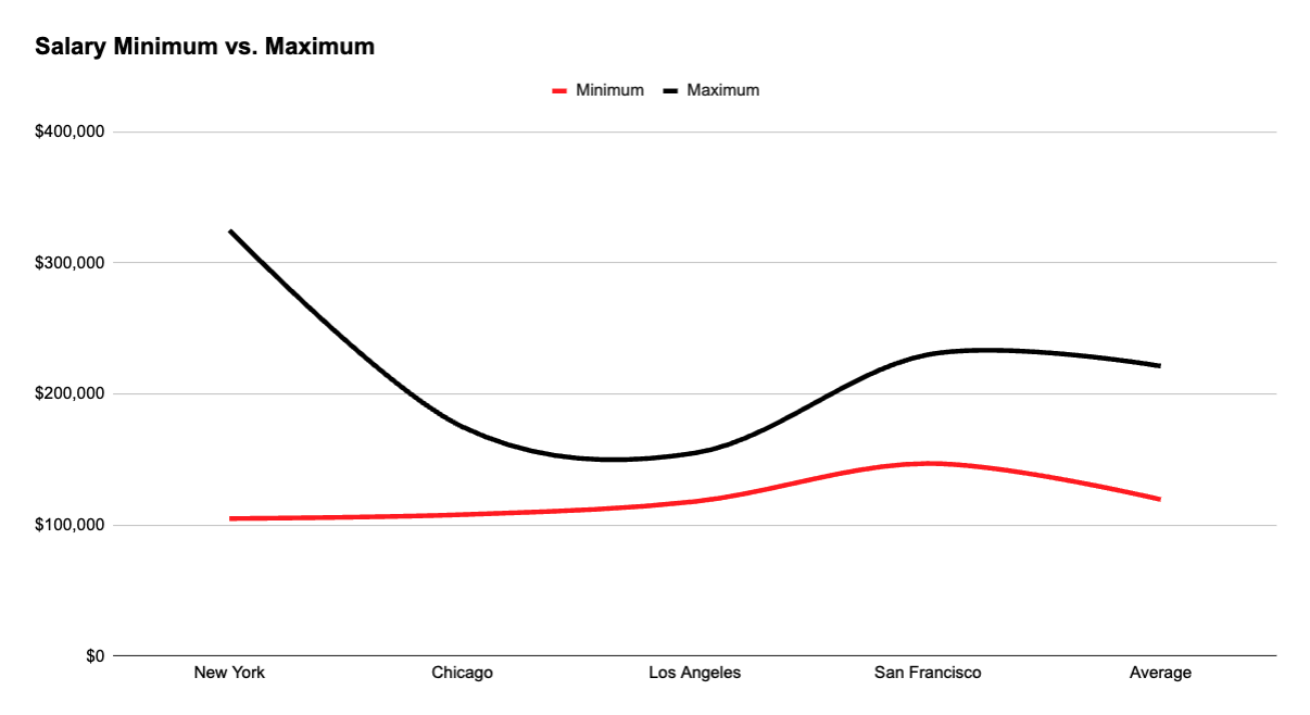 This chart shows the minimum and maximum salary ranges for Senior Product Marketing Managers across major cities. New York has the highest maximum salary, significantly exceeding other locations, while San Francisco offers the most competitive minimum pay. Overall, the data reflects substantial variation in compensation potential depending on location, especially at the upper end of the salary range.
