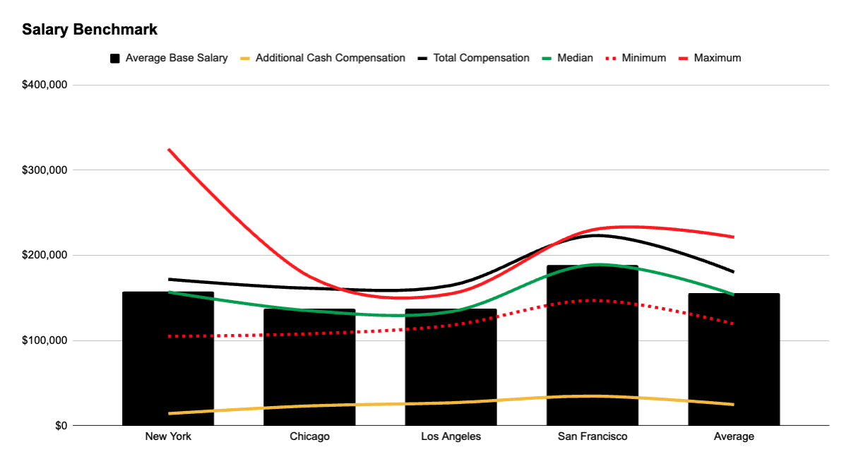 This chart shows average base salaries and additional cash compensation for Senior Product Marketing Managers across key U.S. cities. San Francisco stands out with the highest total compensation, driven by both a strong base salary and significant bonus potential. Other cities like New York, Chicago, and Los Angeles offer competitive base pay, but with smaller bonus contributions compared to the West Coast.