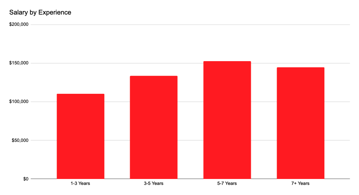 This chart highlights average salaries for Senior Product Marketing Managers based on years of experience. Compensation rises steadily through the 5–7 year mark, peaking at that level before dipping slightly for those with over 7 years of experience. This trend may reflect a transition into higher-level roles beyond the senior manager title as tenure increases.