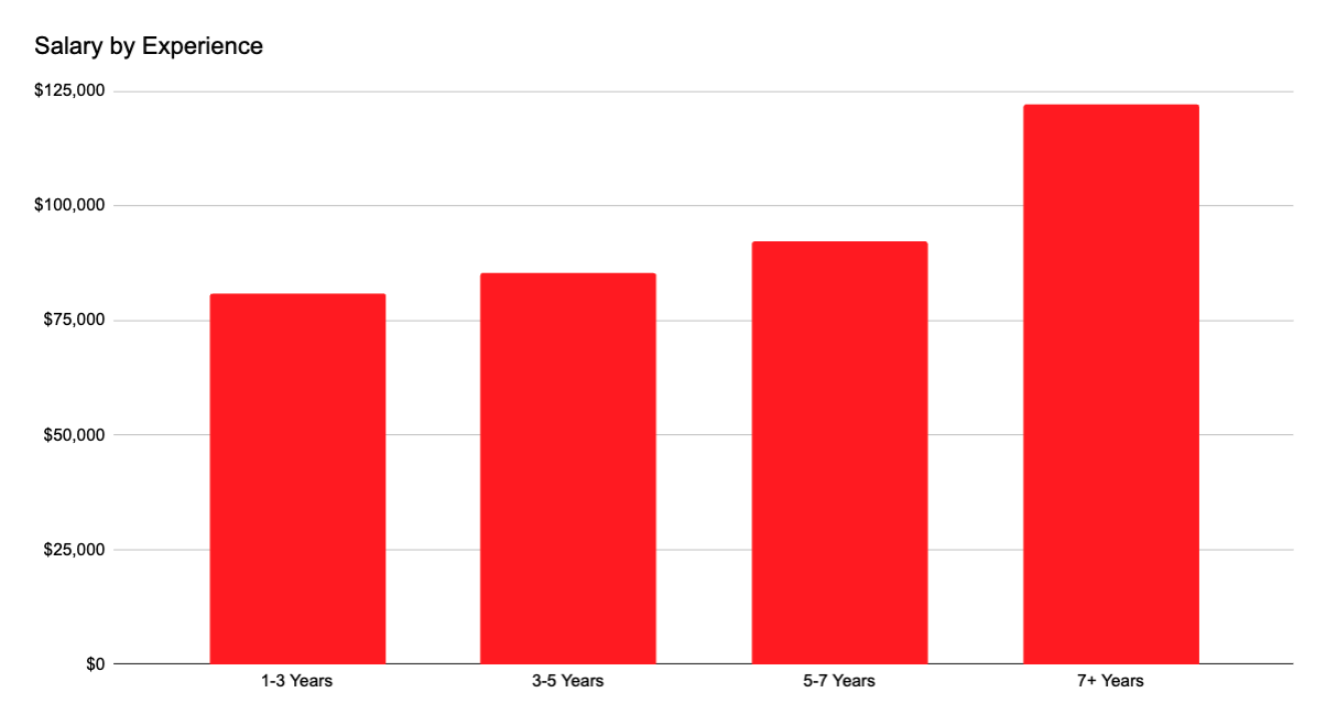 This chart shows how experience impacts salaries for SEO Managers. Professionals with 1–3 years of experience earn around $80,000, while those with 7+ years see a significant jump, earning close to $125,000. This highlights strong salary growth potential in SEO as expertise and tenure increase.