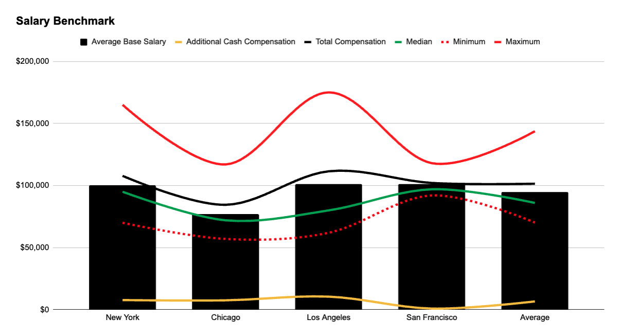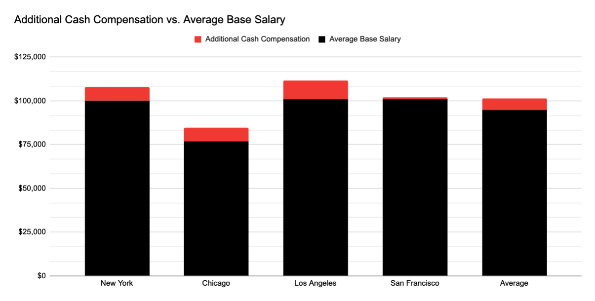 This chart compares the average base salary and additional cash compensation for SEO Managers across major cities. Los Angeles offers the highest combined compensation, slightly surpassing New York, while Chicago reports the lowest overall earnings. On average, additional compensation provides a meaningful boost to total earnings, especially in cities with higher base salaries.
