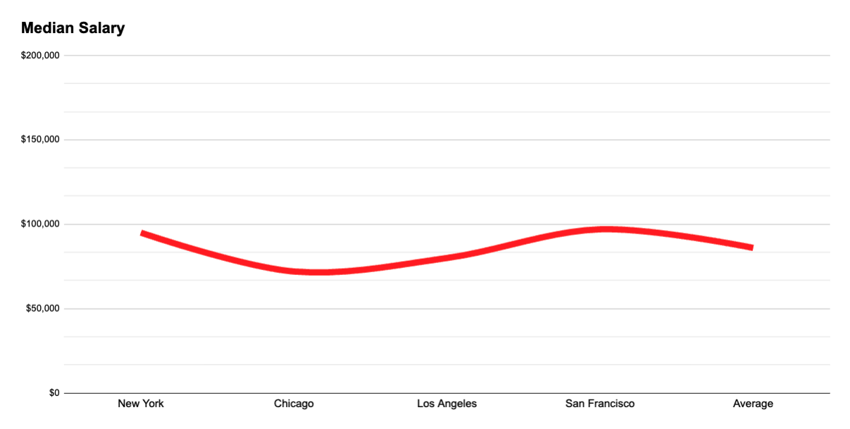 This chart displays the median salary for SEO Managers across different cities. San Francisco offers the highest median salary, followed by New York and Los Angeles, while Chicago has the lowest. Overall, the average median salary across these cities suggests a competitive earning potential for SEO Managers in major markets.
