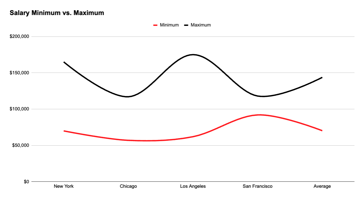 This chart highlights the minimum and maximum salaries for SEO Managers across major cities. Los Angeles shows the highest salary ceiling, indicating strong earning potential, while San Francisco has the highest minimum salary, suggesting a solid base even at entry levels. Chicago has the lowest overall salary range, making it less competitive compared to other cities.