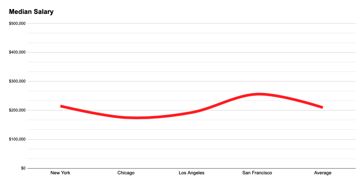 This chart displays the median salary of Vice Presidents of Marketing across major cities. San Francisco offers the highest median salary, followed by Los Angeles and New York, while Chicago has the lowest. The overall trend suggests that cities with strong technology and innovation hubs, like San Francisco, tend to offer higher salaries for marketing executives.