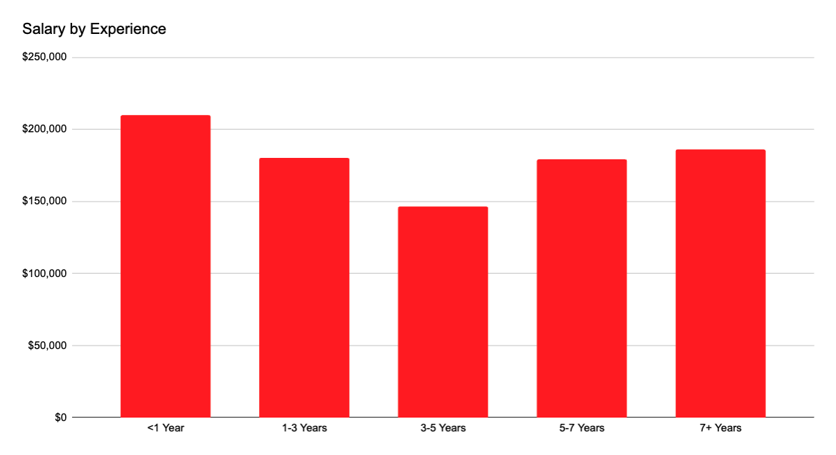 This chart presents average salaries for Vice Presidents of Marketing based on years of experience. Interestingly, those with less than one year of experience report the highest average salary, surpassing even those with 7+ years. This may reflect unique hiring circumstances or higher compensation for externally recruited, fast-tracked executives.