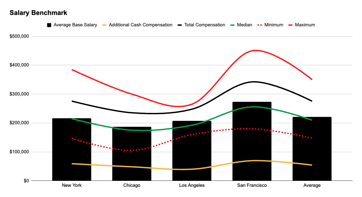 This chart highlights the breakdown of average base salary and additional cash compensation for Vice Presidents of Marketing across key U.S. cities. San Francisco leads with the highest total compensation, driven by both a strong base salary and significant bonus potential. Overall, additional cash compensation plays a notable role in total earnings, especially in competitive markets like New York and San Francisco.