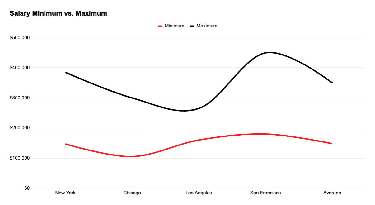 This chart shows the salary range for Vice Presidents of Marketing across major U.S. cities. San Francisco offers the highest earning potential, with both minimum and maximum salaries peaking compared to other cities. While New York also offers a strong maximum salary, the overall average highlights a notable gap between the lowest and highest compensation levels in the role.
